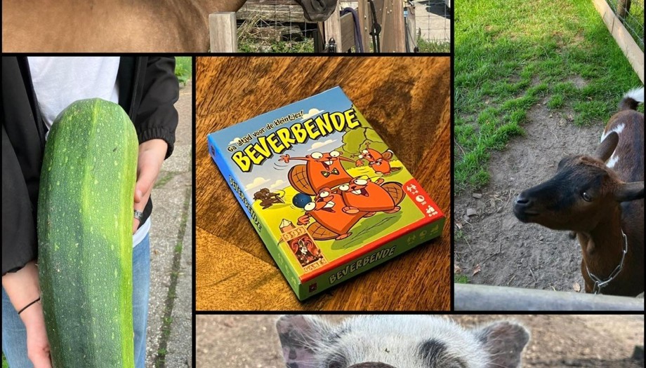 Van 10.00 tot 10.30 is er pauze en doen we vaak een kaartspel dat BEVERBENDE heet. Dat is lachen! Na de pauze gaan we naar buiten. Bijvoorbeeld dieren verzorgen, paarden borstelen en de stallen uitmesten. Livya: Wij hadden vandaag corvee dienst en moeten dan de lunch voorbereiden voor allemaal. Sam vertelt dat er op dinsdagen gezamenlijk warme maaltijden worden gekookt met groenten die ze zelf uit de tuin hebben gehaald! Courget, tomaten, komkommer enz.
