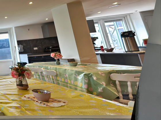 Ook tussen de werkzaamheden door kan een ieder die er behoefte aan heeft zich even terug trekken in de kantine.